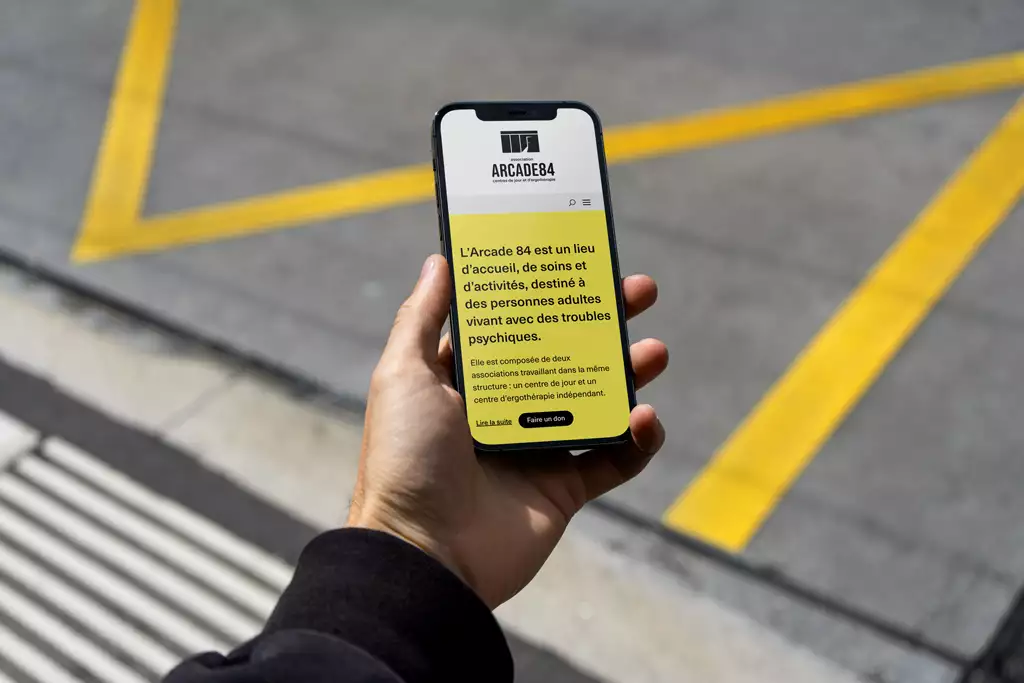 Identité visuelle et supports de com (web, print) de l'association Arcade84. L’Arcade84 est un lieu d'accueil pour les adultes vivant avec des troubles psychiques.