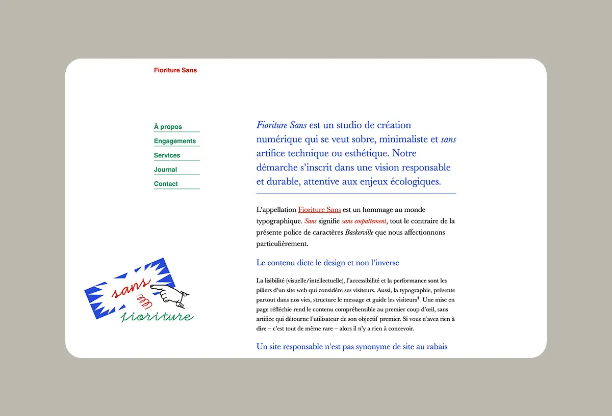 Fioriture Sans est un studio de design numérique responsable éco-conçu avec une moy. de 92/100 et une cotation A à l’EcoIndex (GreenIT)